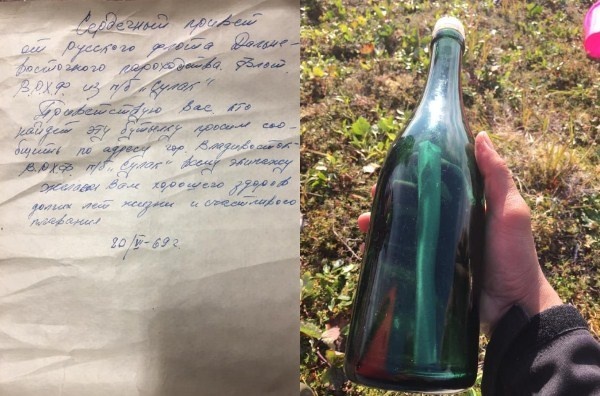 В послании советский моряк передаёт привет от Русского флота Дальневосточного пароходства и желает обнаружившему записку ««хорошего здоровья, долгих лет жизни и счастливого плавания».