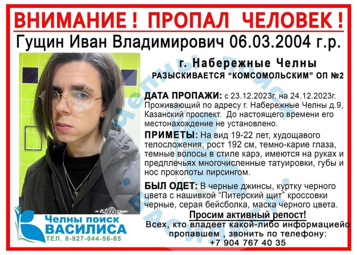 Чаллының “Комсомольский” полиция бүлеге шәһәрдә яшәүче 19 яшьлек Гущин Иван Владимировичны эзли. Ул 23 декабрьдә өеннән (Казан проспектындагы йорттан) чыгып киткән. Соңгы тапкыр әнисенә шул ук көнне кичке 11ләр тирәсендә шалтырткан. Шуннан соң юк булган, дип яза “Челнинские известия”.