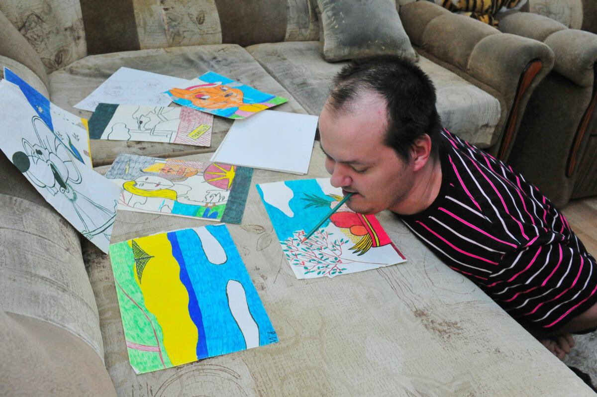 Интернетның файдасы булса да, тик ул Ринатны китап укудан, рәсем ясаудан биздергән. Ә бит авызы белән күпме пейзажлар иҗат иткән! Бер карауга барысын да исендә калдырып, шуны кәгазьгә төшергән. Аның хезмәтләрен район мәдәният йортына күргәзмәләргә тапшырганнар. Әлеге сәләт әтисеннән күчкән. Без килгәч, Ринат моңа кадәр ясаган рәсемнәрен тартып чыгарды.