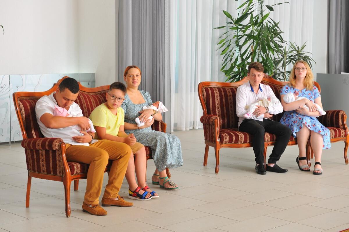Бу көнне куанычларын уртаклашырга килгән Снежана һәм Михаил Сергеевлар кулында да, Наталья һәм Айдар Шәйдулиннар кочагында да – икешәр сабый! Сергеевларда ике кызчык булса, Шәйдуллиннарга 13 июнь көнне кыз да, малай да эләккән, андый игезәкләрне тегеләй-болай гына түгел, «королевские» дип атыйлар!