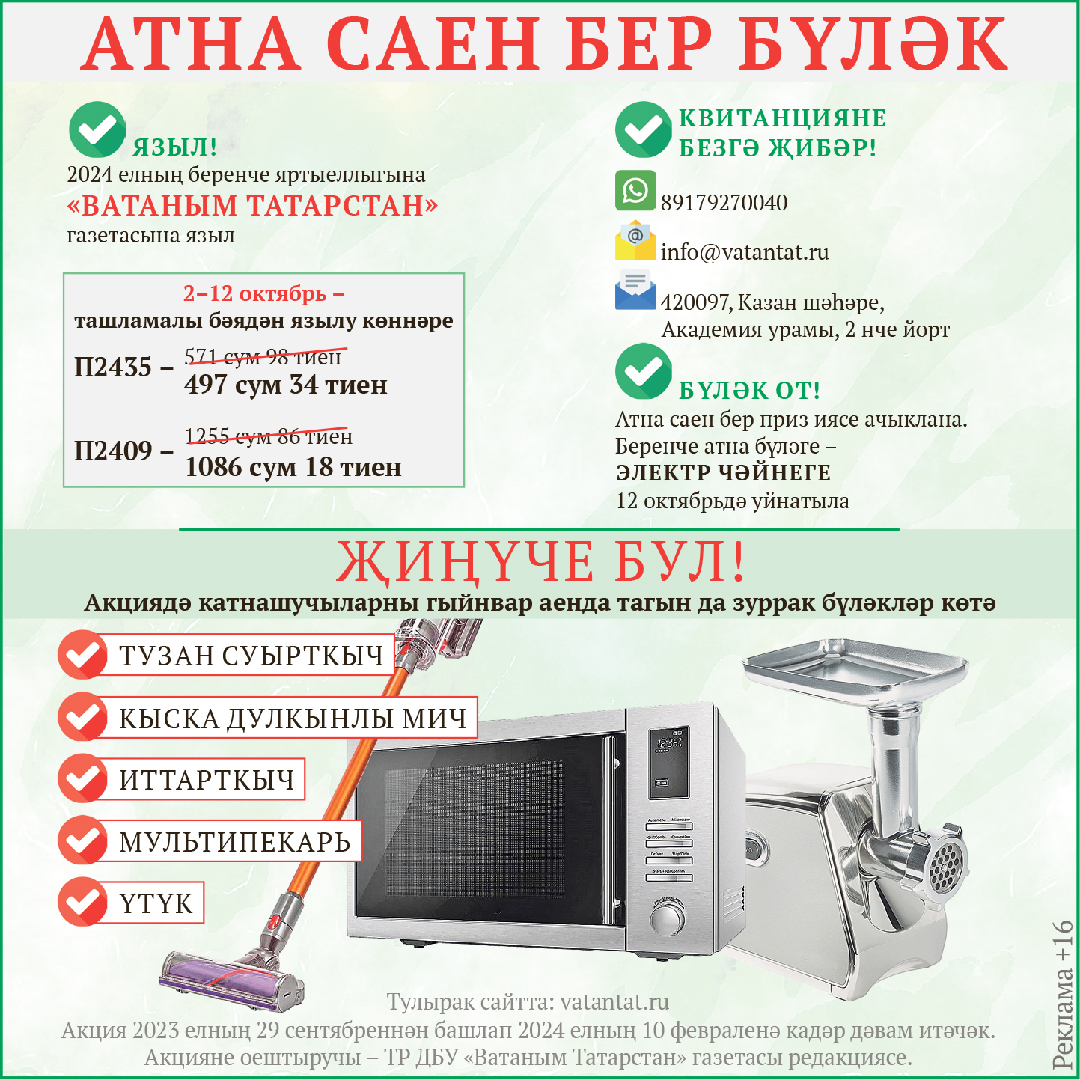 Нибары 497 сум! Ташламалы бәядән «Ватаным Татарстан»га языл да атна саен бүләк от!