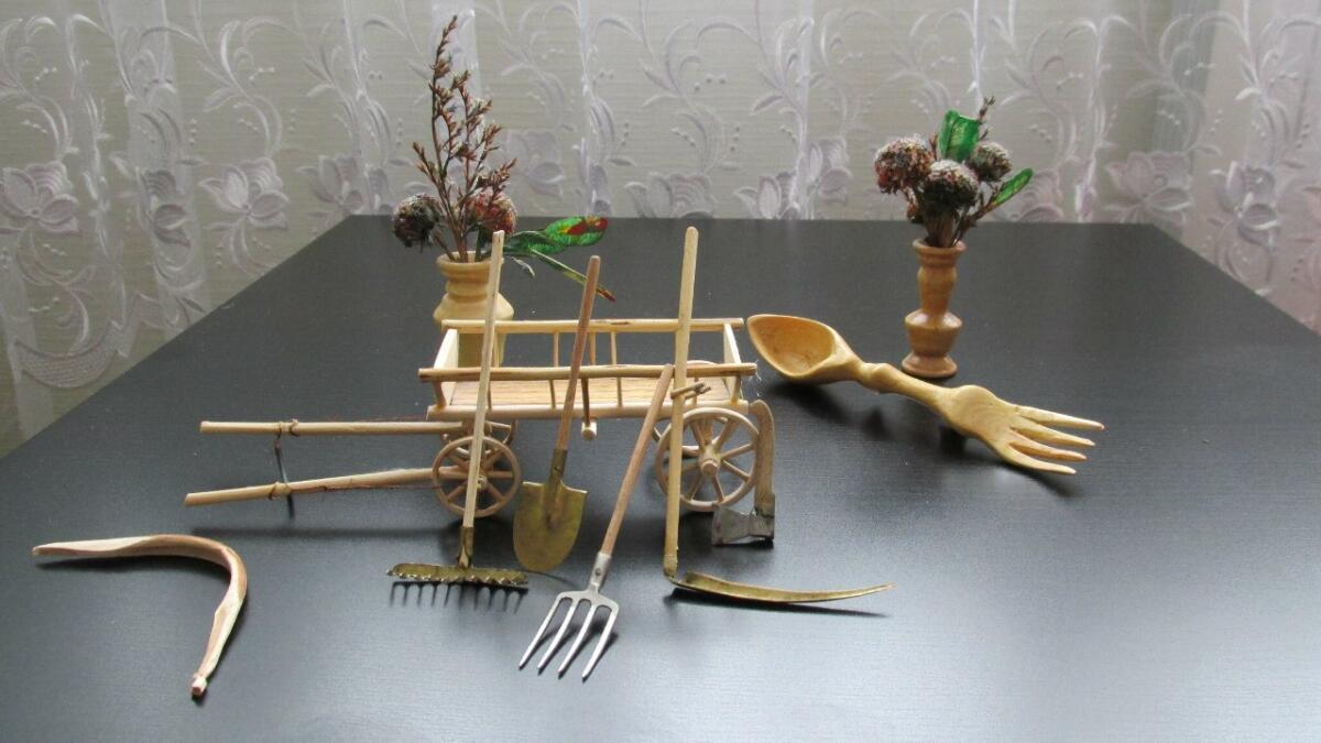 – Башта шырпыларны җилем белән ябыштырып, ярты метр биеклектәге «Сөембикә» манарасын ясадым. Аннары агачтан чана, көрәк, балта, тәгәрмәч, арбалар... Балалар бакчасы өчен хәтта кечкенә чәнечкеләр дә ясаган идем. Бүген инде эшләнмәләрнең саны 500дән артып китте. Төрле авыл мәчетләрен ясап үзләренә бүләк итәм.