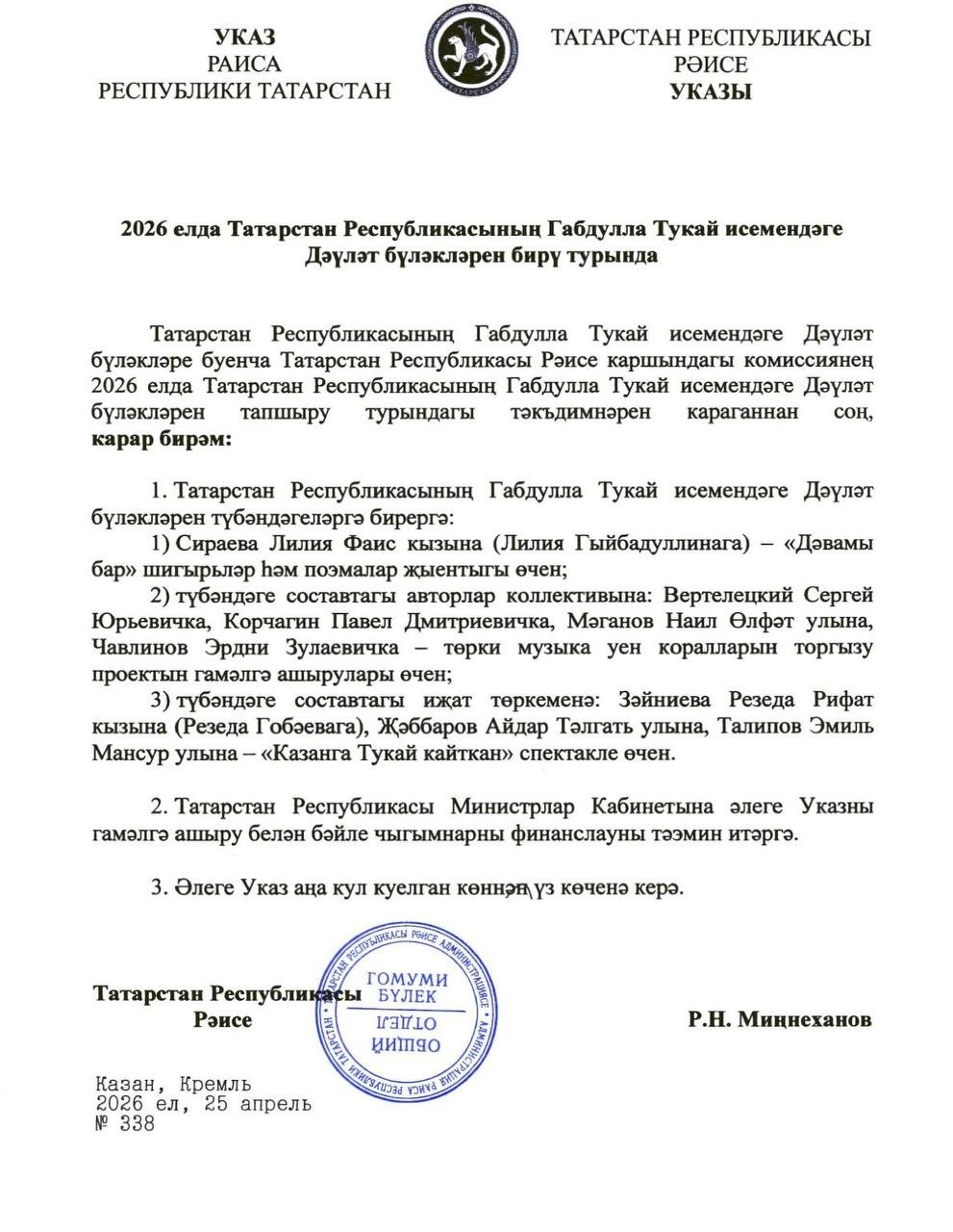 Тиешле Указны Татарстан Рәисе Рөстәм Миңнеханов имзалады.