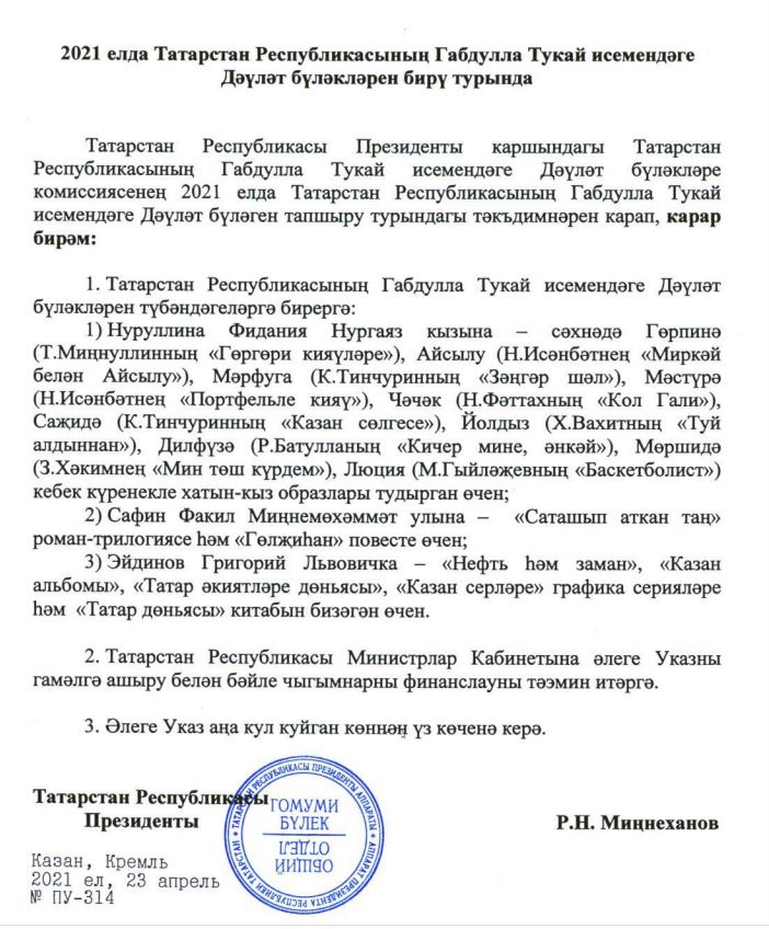 Габдулла Тукай исемендәге Дәүләт премиясе лауреатлары билгеле. Дәүләт бүләген бирү турындагы карарны Рөстәм Миңнеханов 23 апрельдә имзалаган.