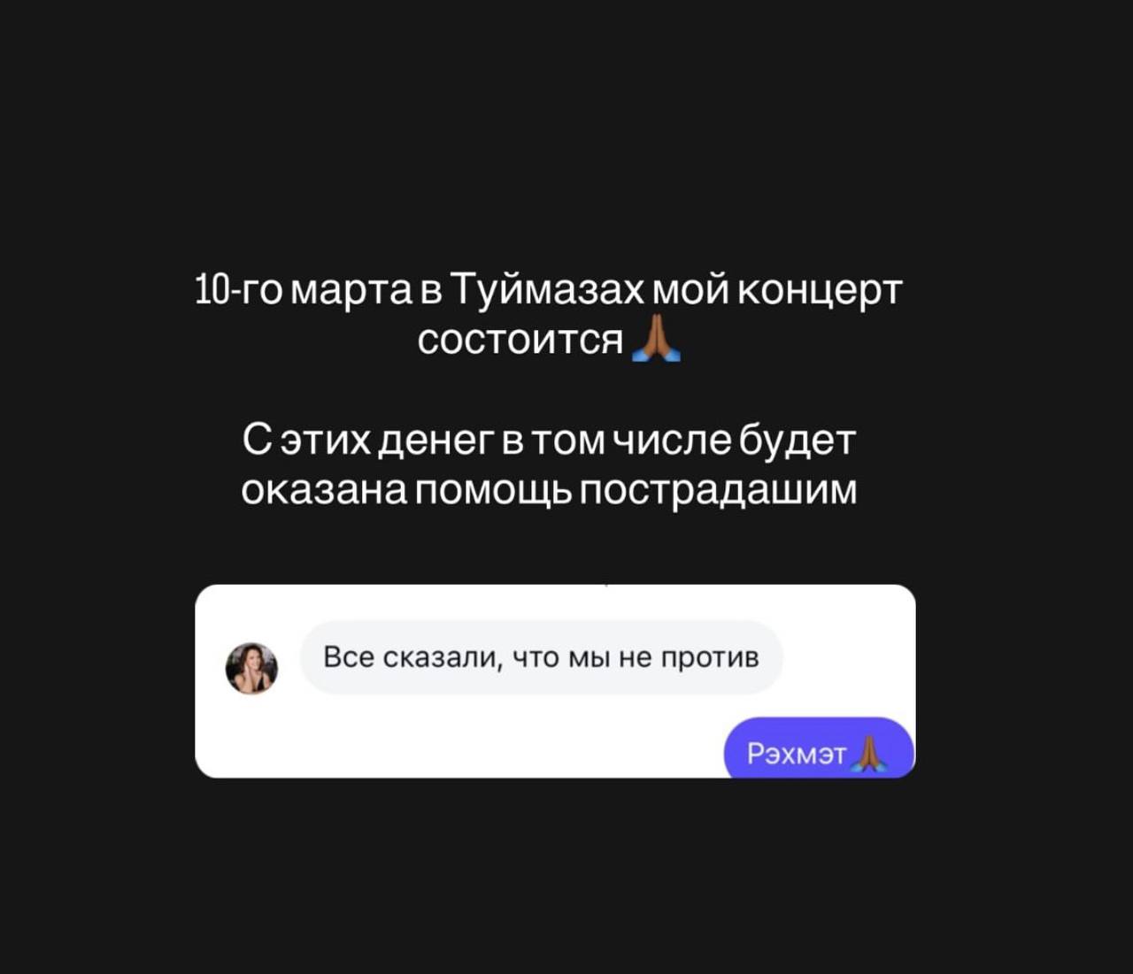 Бүген җырчы хәбәр итүенчә, аның 10 мартта Туймазыда концерты булачак. Әлеге концерттан кергән акча юл һәлакәтендә зыян күрүчегә тапшырылачак. Җырчының статустагы хәбәреннән аңлашылганча, зыян күргән як ярдәмне кабул итәргә ризалык биргән.