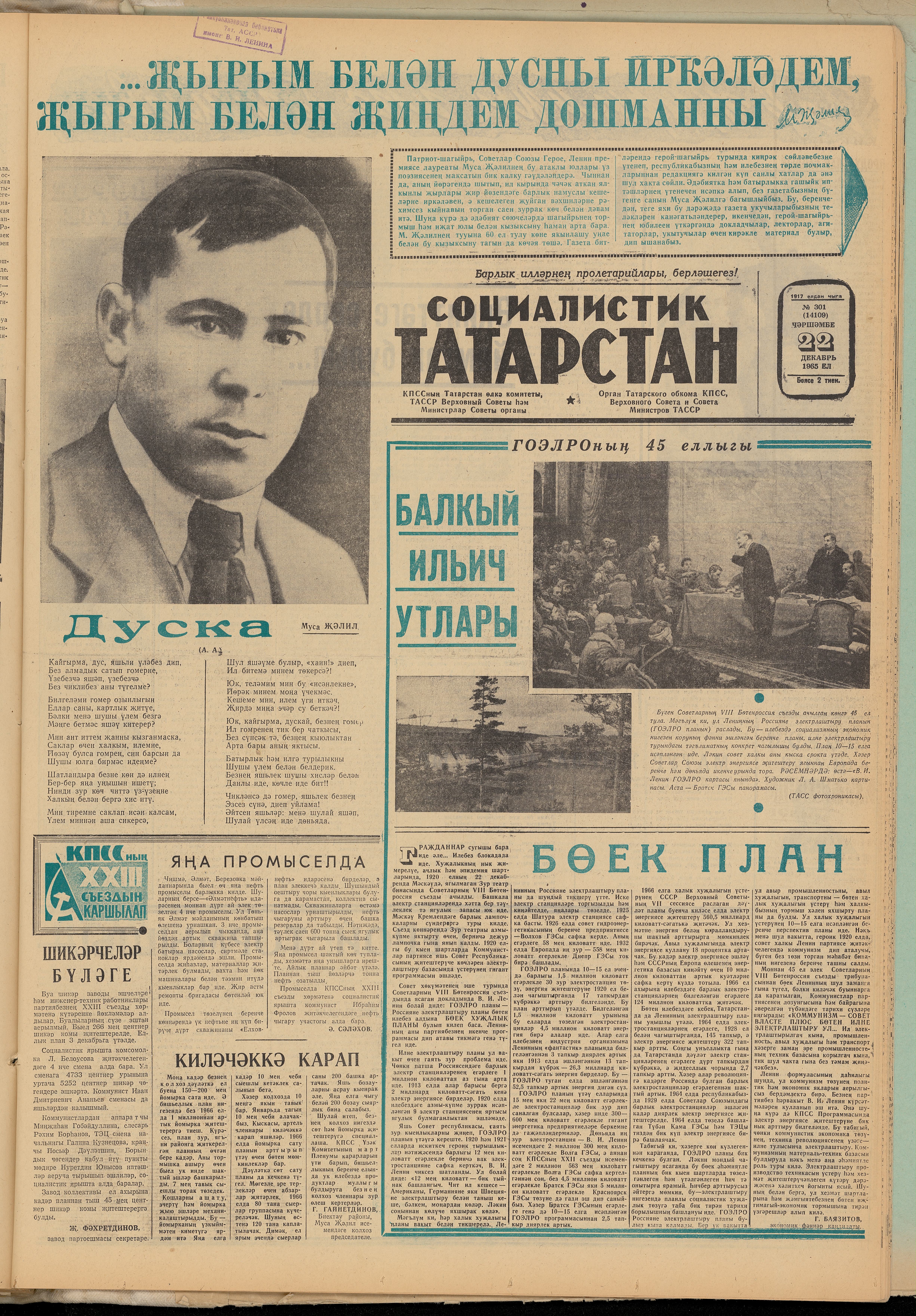 Аннары экскурсовод горурлык белән кечкенә кәгазь кисәгенә гарәп хәрефләре белән язылган текстны укып чыкты... Шагыйрьнең портреты астына түбәндәгечә язылган: «Туган 1906 ел, 15 февраль, 1944 елның 25 августында Берлинда җәзалап үтерделәр».