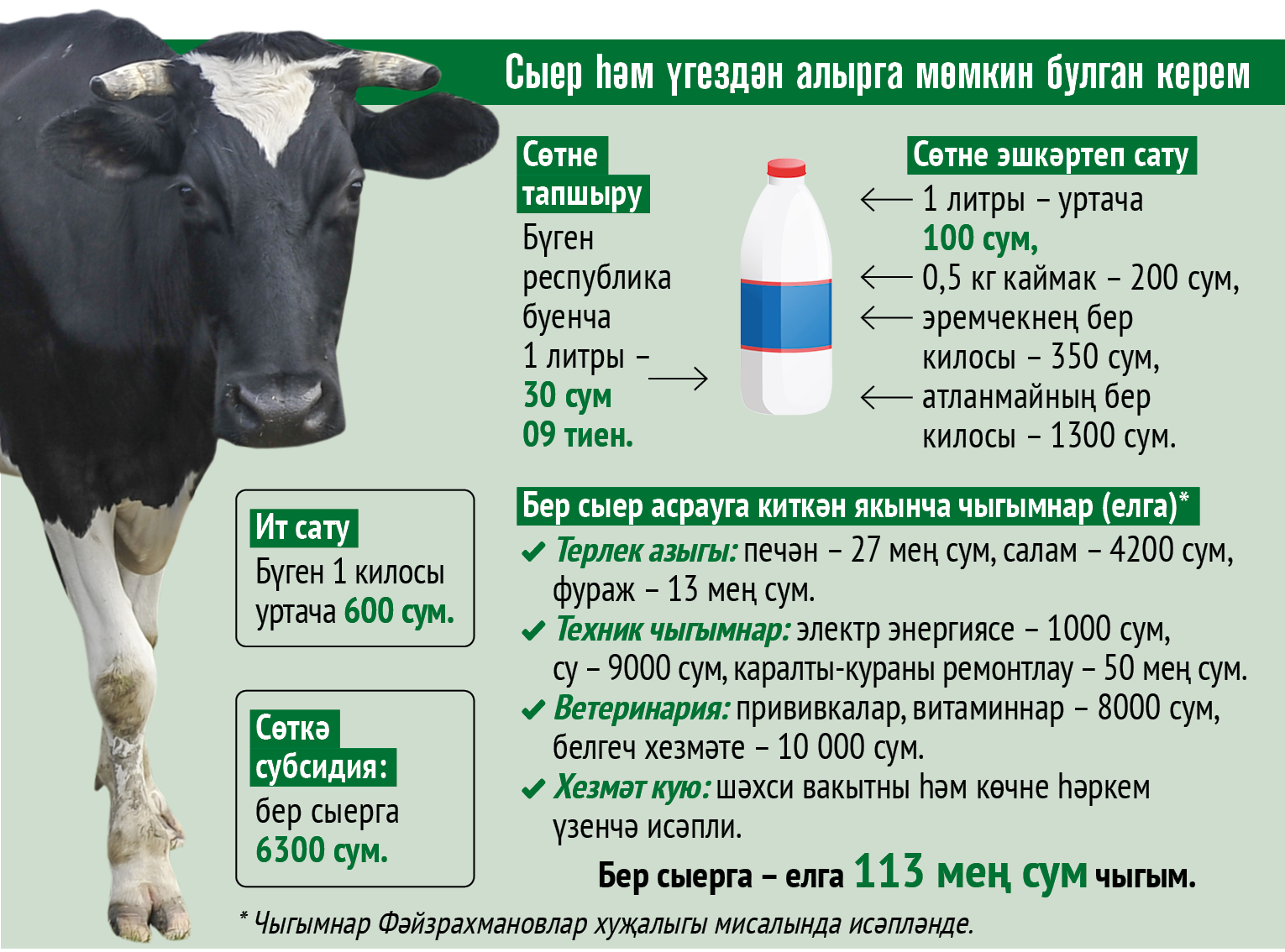 – Без унике баш үгез бозау алып асрыйбыз. 420 мең сумлык бозау алып кайттык. Аларны ашатырга 210 мең сумга фураж, 95 меңгә печән, 45 меңгә салам алдык. Башка чыгымнардан: тегермән тартканга – 8, газ белән су җылытканга – 6, салам-печән өйдергәнгә – 7–8, печән чапкан вакытта ягулыкка – 6, трактор ремонтына – 12 мең сум. Кыскасы, барлык чыгымнар елына 812 мең сум булды. Үгезләрне суйгач, 1 млн 716 мең сум керде. Менә шуннан 900 мең сум файда калды. 15 айга бүлсәк, бер айга 60 мең сум хезмәт хакы дигән сүз, – диде ул.