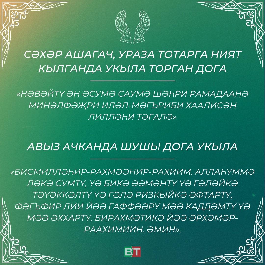Тәрҗемәсе: Әй, Аллаһым! Ошбу уразамны Синең өчен генә тоттым һәм Сиңа гына иман китердем, вә Сиңа тәвәккәл кылдым; вә Синең ризыгың белән авыз ачамын. Әй, гөнаһларны ярлыкаучы Раббым! Минем моңа кадәр кылган гөнаһларымны да, соңгыларын да ярлыкасаң иде. Әмин.