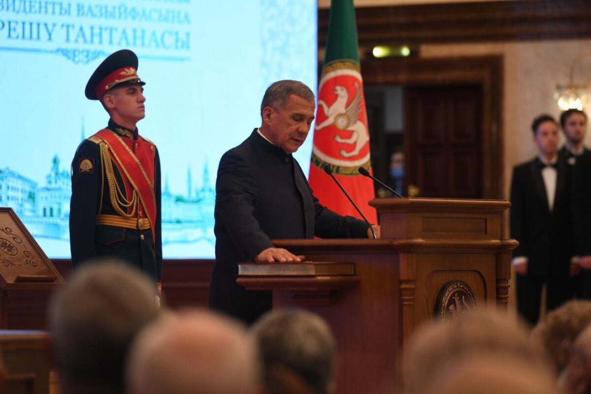«Татарстан Республикасы халкына тугры хезмәт итүем, гражданнар хокуклары һәм ирекләрен, Татарстан дәүләт суверенитетын тәэмин итү, РФ һәм ТР Конституцияләрен, законнарны үтәү, миңа йөкләнгән югары вазифаларны намус белән үтәячәгем турында тантаналы рәвештә ант итәм», — диде Рөстәм Миңнеханов.