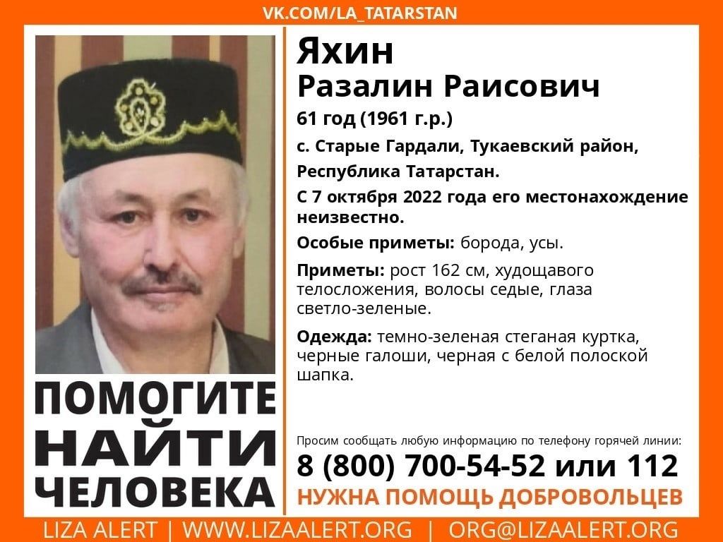 Тукай районында яшәүче 61 яшьлек ир-ат югалган. Ул Иске Гәрдәле авылында гомер иткән, аны соңгы тапкыр 7 октябрьдә күргәннәр.
