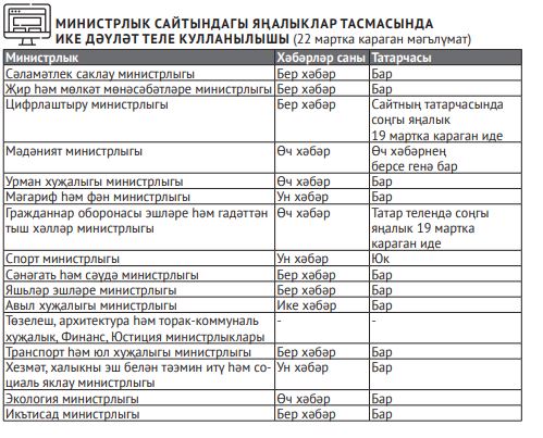 - Саннар матур да, алар ни дәрәҗәдә эчтәлеккә туры килә соң? Шул уңайдан 20гә якын министрлыкның рәсми сайтларына бер күз йөртеп чыктык. Яңалыкларны тәрҗемә итү өчен күпмедер вакыт кирәк икәнен онытмыйча, бу атнаның дүшәмбесендә (22 март) чыккан хәбәрләрне сайладык.