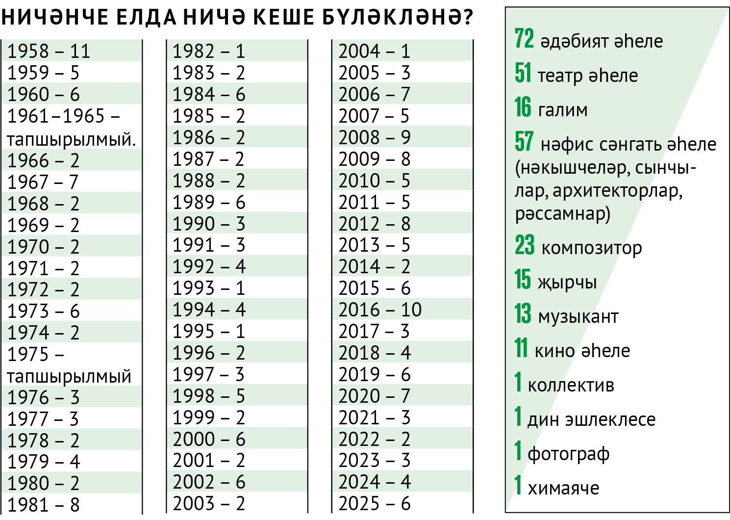 Барлыгы – 250 җиңүче (шул исәптән бер коллектив – Татарстан Дәүләт җыр һәм бию ансамбле, 1960 елда бирелә)